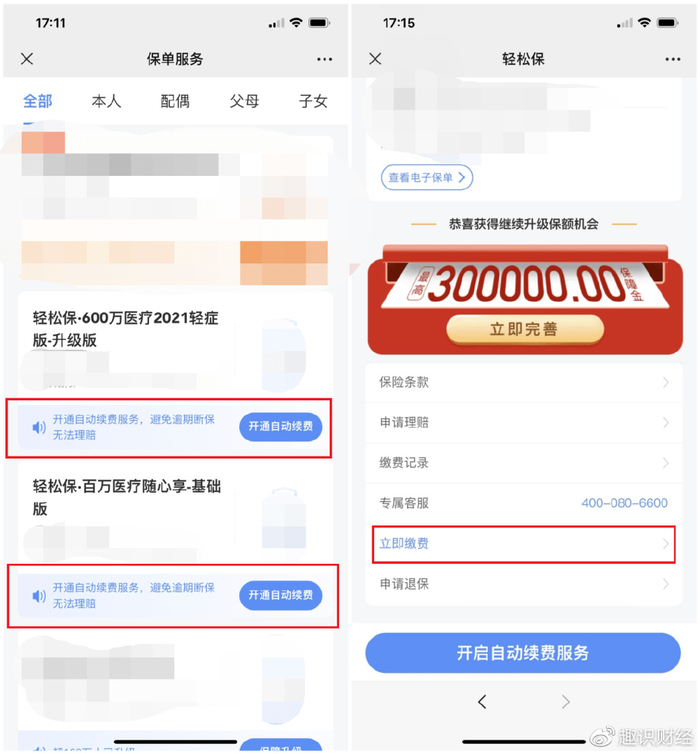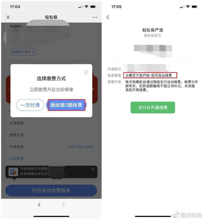值得一提的是,当柒财经将该保险产品的自动续费功能关闭后,轻松严选平台显示,“开通自动续费服务,避免逾期断保无法理赔”。此外,在未开通自动续费服务前提下,柒财经缴纳第2期保费,跳转到支付后发现,仍被开通自动续费功能。