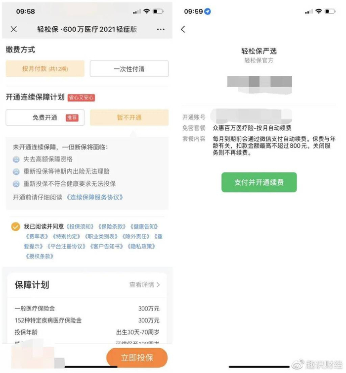 同样是600万的医疗险,承保公司为太平财产保险有限公司。柒财经按照前述步骤进行投保,依旧找不到对“自动续费”是否开通的选项,点击投保后跳转至支付保费及开通自动续费页面。