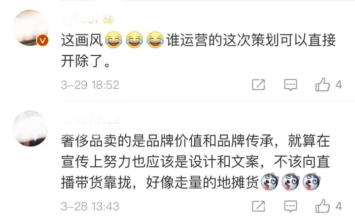为了增加品牌的网络曝光量实现流量转化,品牌舍弃品牌高贵调性采用接地气的方式去吸引用户的行为,仿佛让LV失去了灵魂,这也与优雅、自信、高贵的品牌气质相违背。