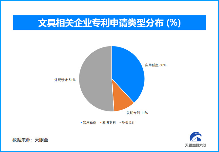 天眼查专业版数据显示,截至目前我国文具相关的企业专利申请总数超过4.98万件,其中外观设计专利占其中的一般以上,占比51%。随后则是占比38%的实用新型专利和占比11%的发明专利。同样可以得到结论,文具的颜值是消费者首要追捧的对象,但实用技术和科技的基因占比也在文具行业逐步加大了占比。