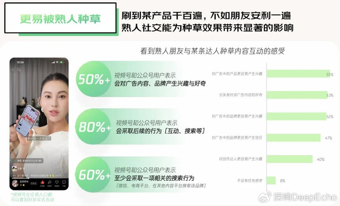 在视频号,用户互动偏好熟人点赞过的内容,互动动机为展示自我或有意让朋友看见该内容。增长黑盒线上用户调研数据显示,大多数用户都更容易被熟人种草,其中50%视频号、公众号用户表示,会对熟人朋友与达人互动的种草内容、品牌产生兴趣,80%会采取后续行动,如参与互动、主动搜索更多信息。