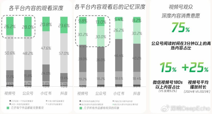 从深度上看,视频号、公众号则有着更高的内容观看深度和记忆深度。调研显示,视频号用户深度内容消费意愿达到75%,在观看某个达人作品时,公众号和视频号的完播表现也更高。