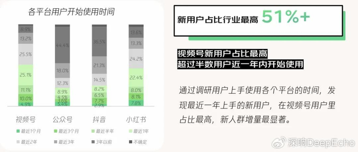 京腾生态的流量是很新的。数据显示,最近一年上手的新用户,在视频号用户里占比最高(超过51%),新人群增量最为显著。而从使用时间的维度来看,视频号用户的使用时长净增长达43%,公众号用户的使用时长则最稳定。