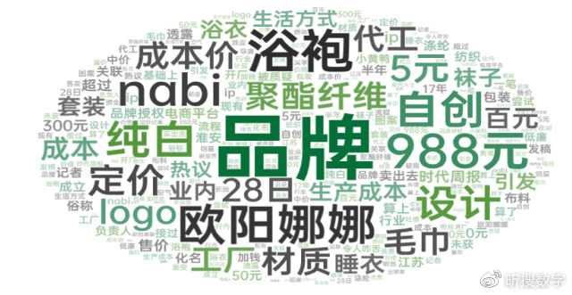 热词云图显示,本次事件,品牌、浴袍、欧阳娜娜、988元、纯白成为高频词。