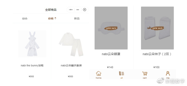 截至2022年11月30日14时,销售情况看,nabi品牌8款纯白系列商品中,6款已显示“sold out”,仅剩988的“nabi the bunny浴袍”“nabi云朵睡衣套装”2款仍在售。