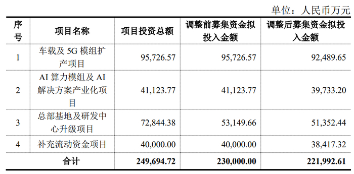 移远通信计划将资金主要用于车载及5G模组扩产项目、AI算力模组及AI解决方案产业化项目、总部基地及研发中心升级项目和补充流动资金。