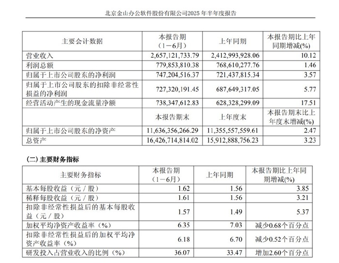 近日,金山办公发布了2025年上半年报告。报告期内,金山办公实现营业收入26.57亿元,同比增长10.12%;归母净利润7.47亿元,同比增长3.57%;扣非净利润7.27亿元,同比增长5.77%。