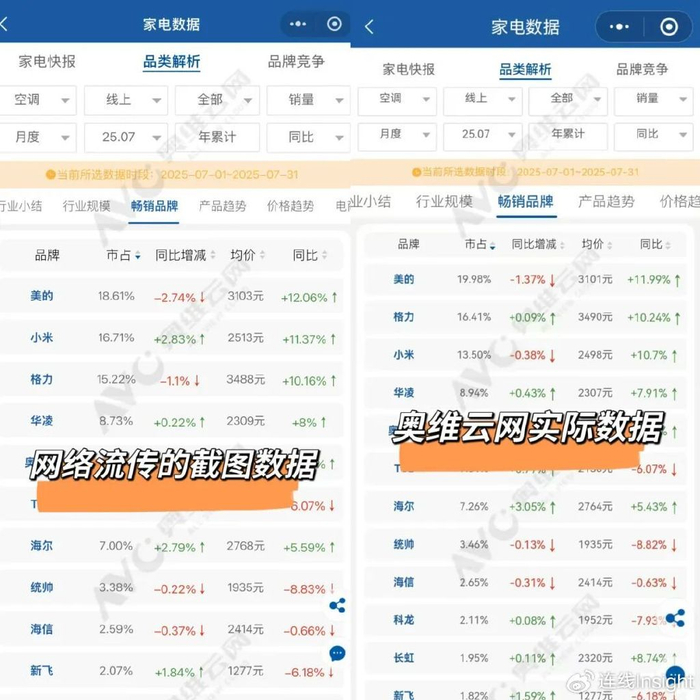 值得注意的是,朱磊微博的数据截图显示,格力7月线上市场份额为16.41%,小米仅为13.50%。两组数据的偏差,成为此次“口水战”争论的焦点。