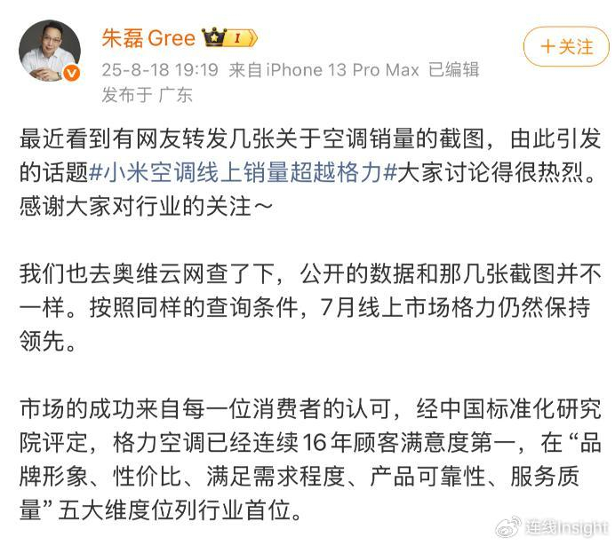 “7月线上市场份格力依然保持领先”。2025年8月18日,格力电器市场总监朱磊在微博上发文反击,否认了小米空调7月线上销量超越格力的说法。朱磊直言,格力去奥维云网查询显示,公开的数据和小米的数据截图并不一样。