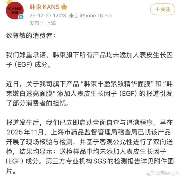 回应中,韩束强调旗下产品均未添加人表皮生长因子成分。韩束表示,早在2025年11月,上海市药品监督管理局稽查局已就该产品开展了现场核验与检测,并基于客观公允性进行了双向送检,结果均显示:送检样品中均未添加人表皮生长因子(EGF)成分。
