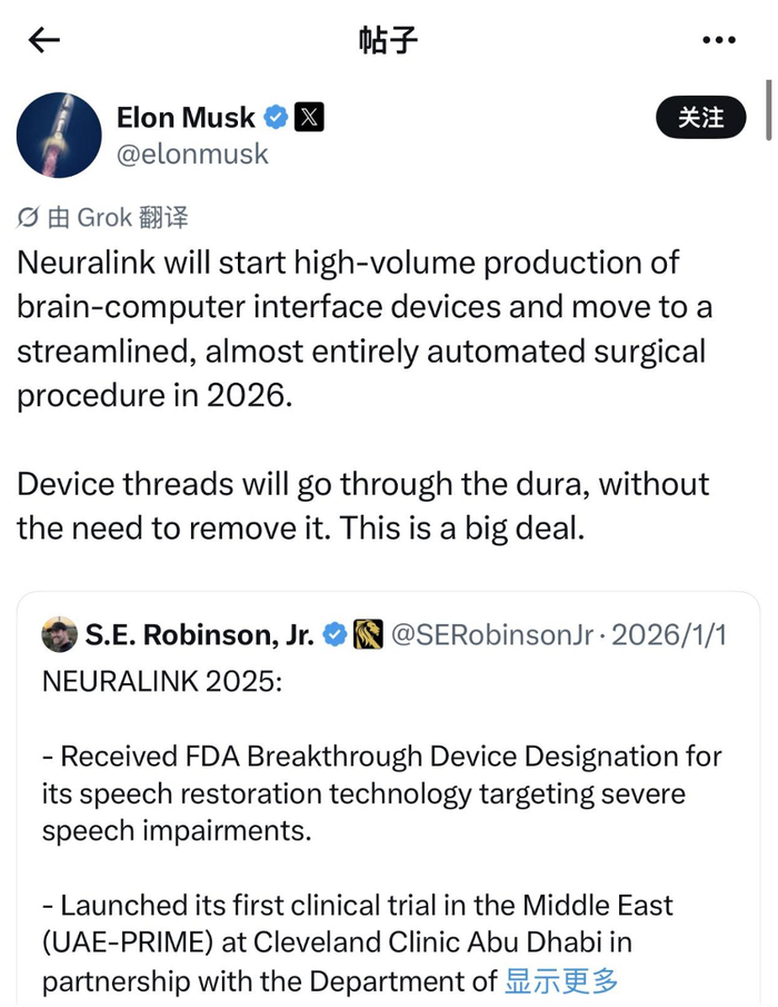 这就绕不开马斯克了。在2025年的最后一天,马斯克在社交媒体上宣布了两个消息:一是 Neuralink 计划于2026年实现脑机接口设备的大规模量产;二是他们通过实验证明,通过脑机接口技术有可能实现人体全身机能的恢复。