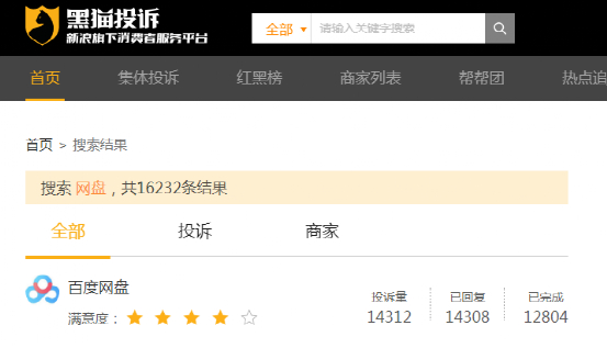 取得如此优秀成绩的百度网盘,在黑猫平台上却有一万四千多条投诉,占据网盘搜索量的88%。投诉平台[下载黑猫投诉客户端]上的某些发声或许会存在一些误会,但一万多条的投诉足以看出用户对百度网盘、对网盘行业的负面情绪。
