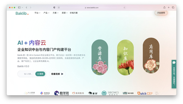 Baklib 是一款 All in Content 的企业级云平台,在B一个平台,实现多站点内容发布:负责管理、汇聚和治理企业所有分散的数字内容,将原始内容转化为可复用、可传承的“知识资产”,助力企业一站式和一体化构建多场景数字体验。 独创的资源库+知识库+应用库三层架构,无缝连接您的品牌、产品、客户和员工,让企业率先拥抱 AI。