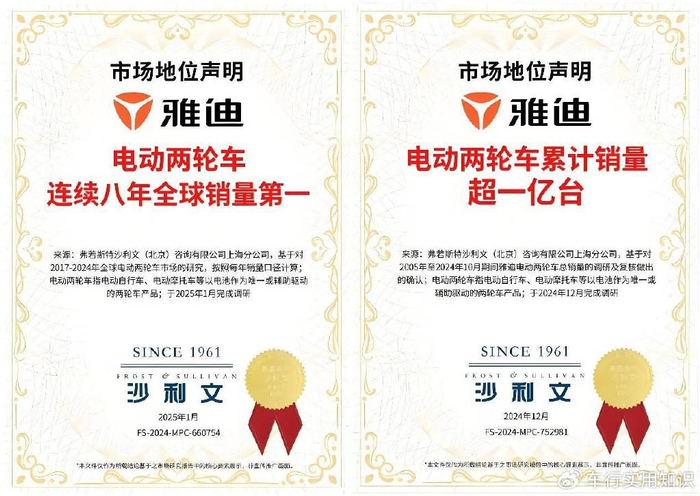 回顾过去八年,雅迪连续占据全球销量第一的宝座,累计销量超1亿台,这一成绩由市场咨询机构弗若斯特沙利文权威认证,成为中国品牌在新能源出行领域的历史性跨越。