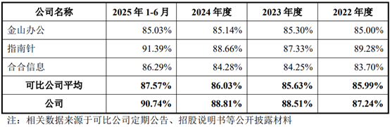 报告期各期,企查查的毛利率分别为87.24%、88.51%、88.81%和90.74%,保持较高水平,与金山办公、指南针、合合信息毛利率大致相当。