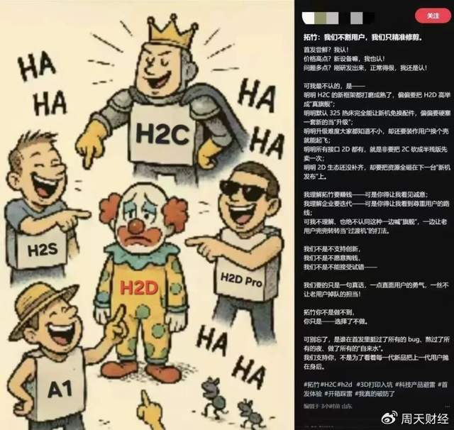 这在3D打印圈引发震动,拓竹显得阵脚大乱,以提前发布新品和给老款降价的方式来进行防守反击,但此举使得老款的第一批铁粉深感背刺,一位购入过拓竹全部机器的深度创作者,原本是「逢拓竹新品必买」,现在表示不会再「无脑冲」了,而是倾向于保持观望。小红书上更是可以刷到不少老用户吐槽的梗图。