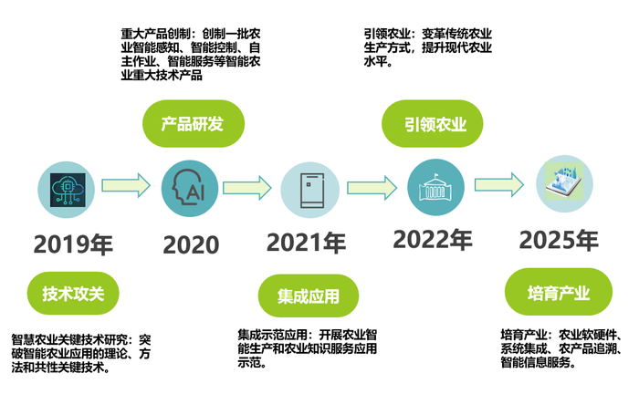 为了进一步推进我国智慧农业技术发展和落地应用,国家出台了一系列政策,并提出了从技术攻关(2019),到产品研发(2020),再到集成应用(2021),引领农业(2022),直到培育产业(2025)的未来智慧农业的发展规划。