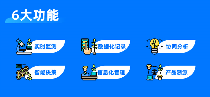 数智丰农DAP管理系统,集成了实时监测、农事记载数字化、多源数据协同分析、人工智能模型决策、精准化管理方案输出、产品溯源等共6大功能。