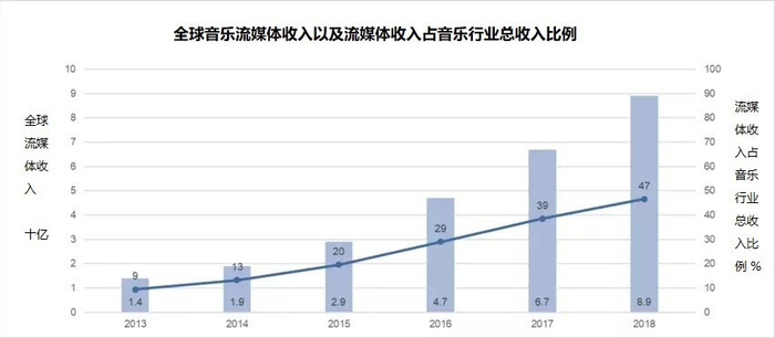 鉴于流媒体的重要性,这场危机可能会加速音乐行业的潜在转型趋势,流媒体占音乐行业总收入的比例在短短六年内从9%增长到了47%。
