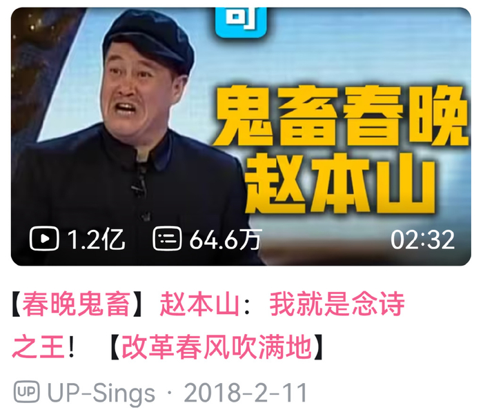在B站上搜索关键词“春晚”,内容五花八门、题材多样。在“春晚混剪”类目中,@UP-Sings2018年发布的《【春晚鬼畜】赵本山:我就是念诗之王!【改革春风吹满地】》如今已收获1.2亿播放量,被收录至“入站必刷98大视频”;而“经典节目回顾”上,也有@MarcusPierce发布的《1990年春晚小品》斩获1289.7万播放量,1.7万评论里几乎每三天就有人掀起一波“回忆杀”。