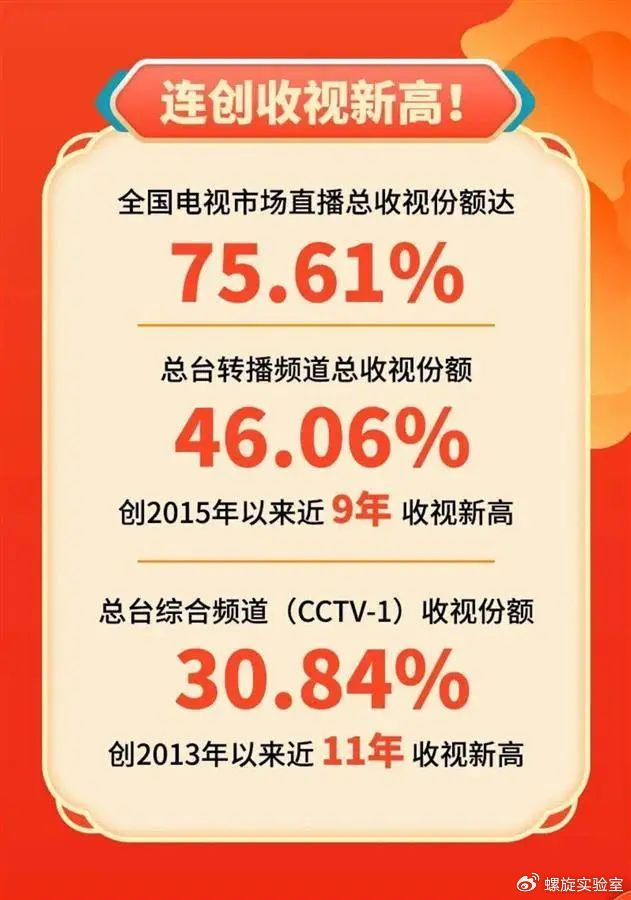 从电视端看,2024年春晚直播总收视份额达75.61%。其中,总台转播频道总收视份额46.06%,创近9年收视新高。