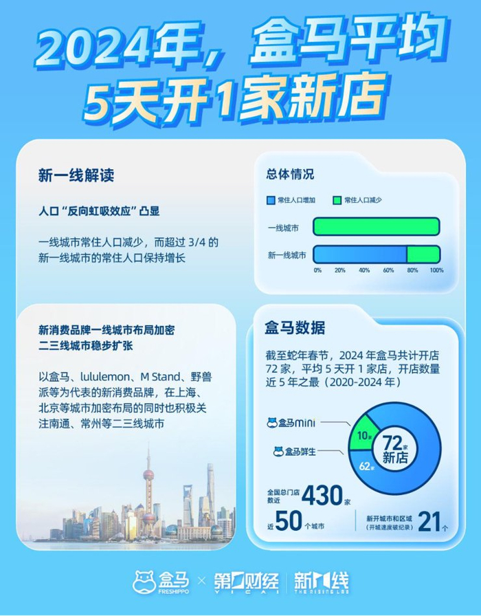 国家统计局数据显示,2024年前11月超市零售额增速为2.6%,行业寒冬持续加剧。在传统巨头收缩战线的寒潮中,盒马以每5天一家新店的闪电速度完成430个线下节点的布局,其下沉市场新店80%入驻撤退中的传统商超旧址,上演着新零售对旧秩序的迭代。
