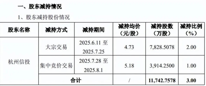 2025年5月,当时持股5.01%的杭州信投因自身资金需求,发布公告将减持公司股份不超过3%,并在8月1日完成减持,累计减持11,742.7578万股,减持套现金额5.73亿元。