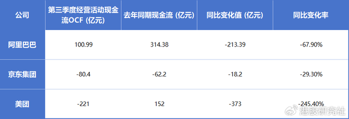 另一方面是现金流,阿里经营活动产生的现金流量净额同比下降68%,但仍然为正数;京东经营活动现金流同比下降29%,负现金流;美团经营活动现金流净流出221亿元人民币,同比减少了373亿元,环比也减少269亿元。