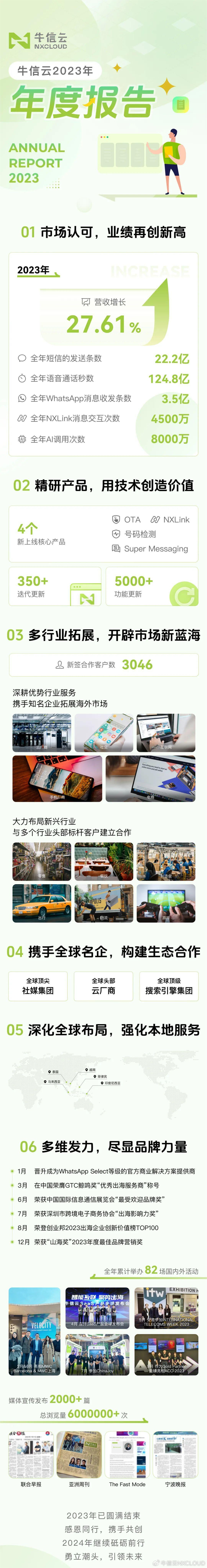 2023年,牛信云在全球市场全面发力,一路高歌,阔步前进,再创新佳绩,全年营收增长27.61%,新签高质量合作客户3046个,全年短信的发送量22.2亿条,全年语音通话时长124.8亿秒,全年WhatsApp消息的收发总数3.5亿,全年NXLink消息交互次数4500万,全年AI调用次数8000万。通过这组数据,坚实、有力地体现了牛信云2023年强劲的发展动能。