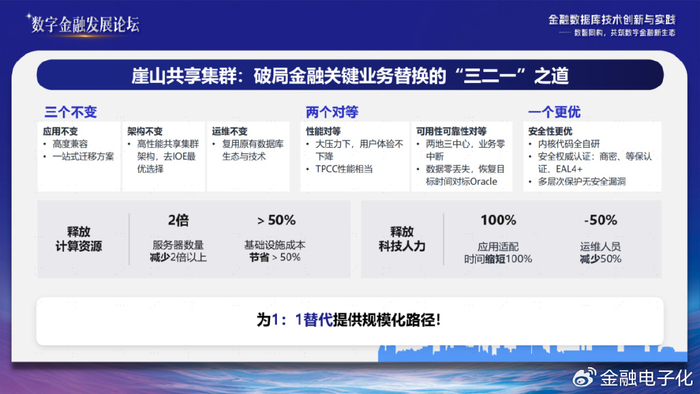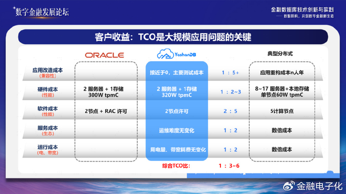 吴良智认为,目前关键业务系统替代多由国有大行等大企业先行尝试,中小企业往往因成本和风险顾虑而踌躇。只有实现规模平替,才能让中小企业在高端场景也用得起、用得上、用得好我国数据库产品。崖山共享集群在综合成本(TCO)方面的显著优势,成为破解这一局面的关键突破口。以共享集群为核心的“1:1替代”方案,打破了传统替代升级方案依赖“业务重构与高额改造成本”的困局,从应用改造、软硬件投入、基础设施资源消耗到服务支出实现全面降本,综合成本降低50%以上,以此释放更多的资源用于业务创新。