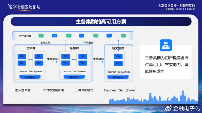 核心替换对业务连续性提出极致要求。基于此,崖山数据库可用可靠性对标国际标准,依托“主备共享集群”及“两地三中心”方案,在确保集群级高可用的前提下,实现机房级故障、区域级故障的无损容灾,达成业务零中断与数据零丢失,故障恢复时间(RTO)与数据恢复点(RPO)均达到行业顶尖水平。
