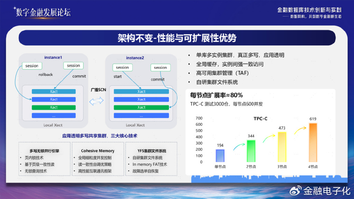 其次是做到“性能、可用可靠性两对等”。性能是支撑核心业务、影响替代成本的决定性因素。YashanDB创新性地采用细粒度多版本并发管理机制、自适应异步事务调度、全局资源运行时调度、去中心化事务管理等技术,突破分布式数据库硬件依赖瓶颈,在TPC-C基准测试中,其4节点集群性能达618万tpmC,单节点扩展比超70%,每秒可承载数千笔交易,满足大多数金融机构关键系统的业务处理要求。