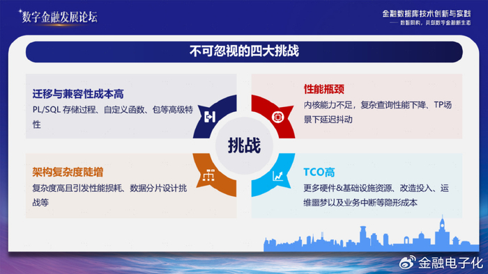 在演讲中,吴良智分享了对金融关键业务系统规模化替代技术路径的理解。他指出,当前的解决方案虽经历了积极的探索,但与规模化复制的目标仍有一些差距,当前有四大不可忽视的挑战。
