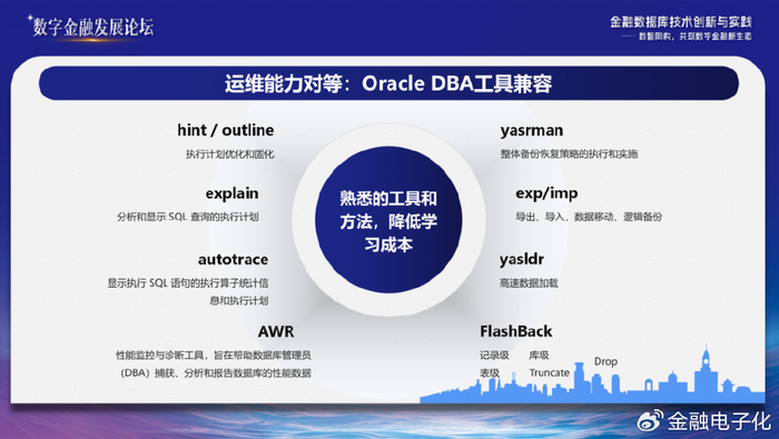 运维能力对等:在运维层面,崖山数据库提供从技术兼容、智能工具到知识赋能的完整解决方案,如DBA熟悉的Oracle运维利器Hint/Outline、AWR报告、yasrman (类比RMAN)、exp/imp、FlashBack等均得到支持,Oracle DBA 技能实现平迁,大幅降低原有技术团队学习曲线和运维切换成本。