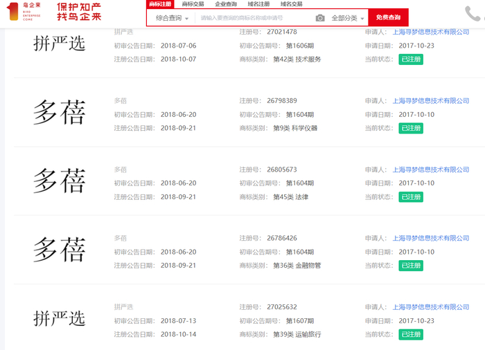 但在商标保护上,拼多多可一点没有亏待自己,不论是文字还是图形的商标注册一应俱全,通过鸟企来知产云平台检索到的结果显示,与“拼多多”相关且注册成功的商标就有20363件,实现全品类注册。