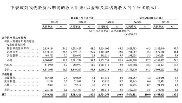 四者相加,在总营收中占比为93.2%,是最主要的营收业务。根据招股书,2019年—2022年上半年,轮胎营收占比分别为54.6%、48%、43.2%、39.9%,逐年下降;汽车保养营收占比分别为26.6%、29.9%、32.8%、34.4%,逐年上升。