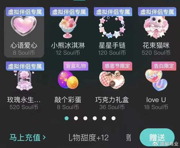 用户与“屿你”“小桃兔兔”日常对话可以增加“甜度”,想要额外再加甜度需要送付费礼物,礼物价格在8Soul币到520Soul币不等(1元=5Soul币);此外想要增加与虚拟伴侣的语音通话时长也需要付费,10分钟通话需要12Soul币。