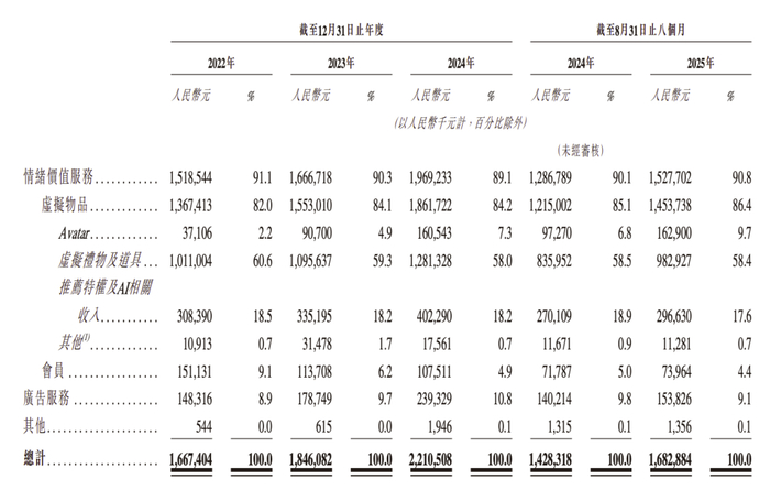 Soul的主要收入也来源于此。Soul的收入分为情绪价值服务、广告及其他收入,其中情绪价值服务在总收入占比超过9成。招股书显示,2022年至2024年,Soul的营收从16.67亿元增长至22.11亿元;情绪价值服务收入也从2022年的15.18亿元增加至2024年的19.69亿元。