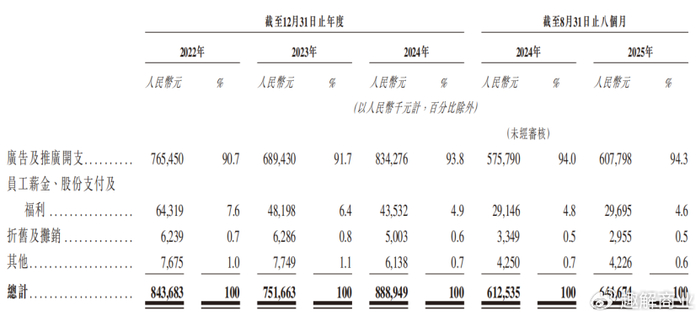 2022-2024年、2025H1,公司销售及营销开支分别为8.44亿元、7.52亿元、8.89亿元和6.45亿元,销售费用率高达50.6%、40.7%、40.2%和38.3%;其中,广告及推广开支占销售费用的90%以上。