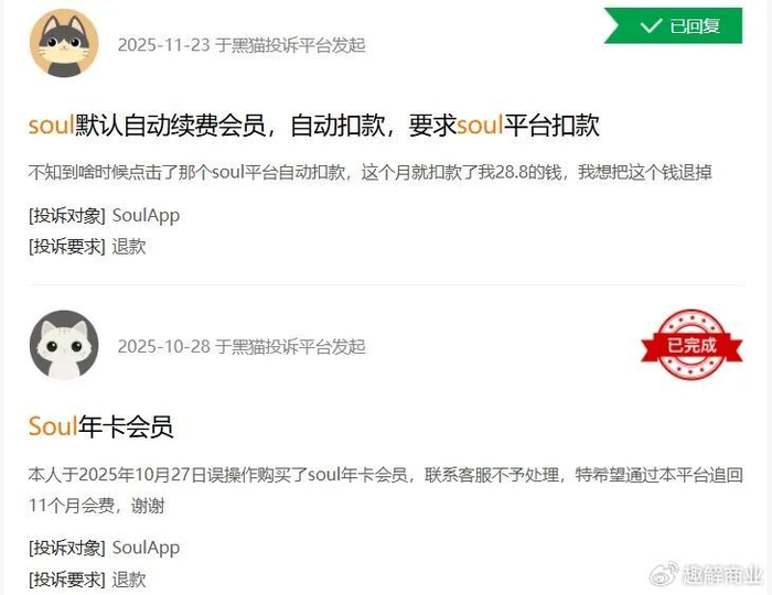 此外,“黑猫投诉[下载黑猫投诉客户端]”平台上有超过5600条投诉中包含搜索词“soul”,其中不少投诉反映平台自动续费、退费困难等问题。