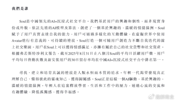 值得注意的是,与前几年不同的是,Soul最新招股书的核心叙事从“元宇宙社交”转向了AI驱动的“情绪陪伴”。