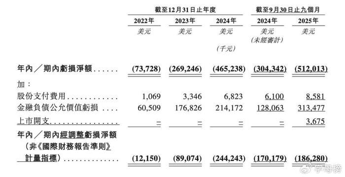 MiniMax仍在亏损,这在意料之中。根据招股书,MiniMax于2022年、2023年、2024年以及截至2024年及2025年9月30日止九个月年度,经调整亏损分别是1215万美元、8907万美元、2.44亿美元、1.7亿美元及1.86亿美元。