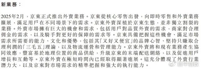 根据绩后业绩会和财报内文的描述,京东在外卖这块业务上给人更多的印象是从容不迫、步步为营,看不出有什么紧迫感;更多的内容是在强调,中国有足够大的市场容量,容下多个外卖平台,京东将贯彻“三毛五”理论;坚持只赚取合理利润,利用京东外卖和现有业务的协同效应,促进用户增长和互动等等。