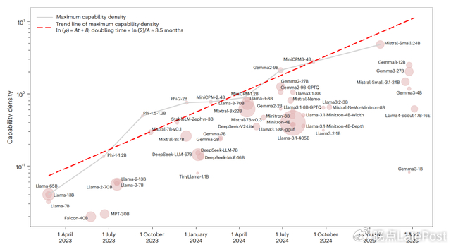 此图描述了 2023 年 4 月之后,主要开源模型的能力密度的变化。能力密度是衡量单位参数 / 算力下,模型能力的指标。目前版本的密度法则总结了预训练大语言模型的密度变化,o1、R1 等后训练强化学习对能力密度的提升尚未体现在指标里。