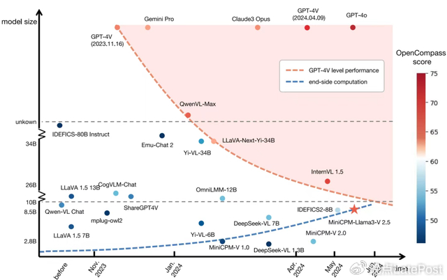 在《自然·机器学习子刊》的这篇论文之前,我们还有一篇发在《自然通讯》上的论文,是关于 MiniCPM-V(注:指论文 Efficient GPT-4V level multimodal large language model for deployment on edge devices),其中有张经典的图,就是描述密度法则结合硬件演进,能让端侧设备承载原来云端服务器上跑的模型才有的能力;具身智能团队最关心的就是,端侧的大脑什么时候可行。