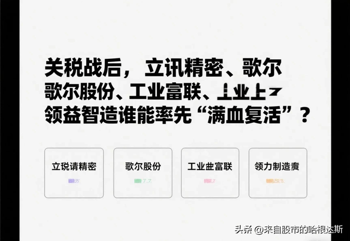 最近中美关税拉锯战打得热闹,消费电子板块就像坐上了过山车。从年初的集体跳水,到二季度的绝地反弹,再到最近的关税豁免大礼包,相关企业的股票走势比电视剧还精彩。今天咱们就来扒一扒这个赛道里的四大金刚,立讯、歌尔、工业富联、领益智造,看看这些科技大佬们除了造手机耳机,还藏着哪些"秘密武器"?
