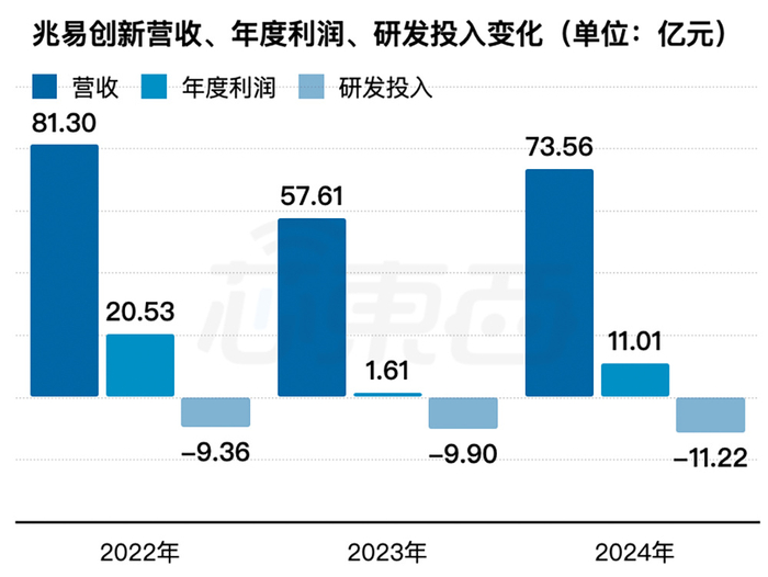 2022年,2023年、2024年,兆易创新的收入分别为81.30亿元、57.61亿元、73.56亿元,年度利润分别为20.53亿元、1.61亿元、11.01亿元,研发开支分别为9.36亿元、9.90亿元、11.22亿元。
