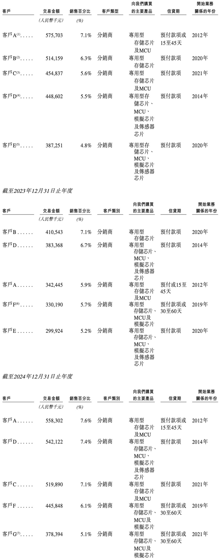 2022年、2023年、2024年,兆易创新向五大客户的销售额分别占相应期间总销售额的29.3%、30.6%、33.3%。