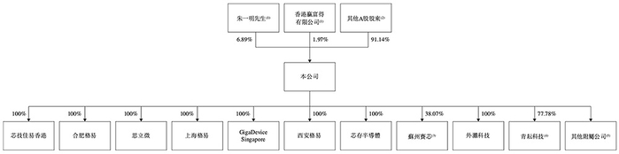 兆易创新的股权及企业架构如下所示,其创始人朱一明持股6.89%。
