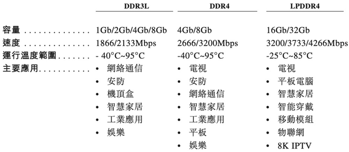 (3)利基型DRAM:包括DDR3L/DDR4/LPDDR4等,具备低功耗、体积小的特点,主要应用于机顶盒、电视、网络通讯、智慧家庭装置、智能穿戴、信息娱乐系统等多种领域。